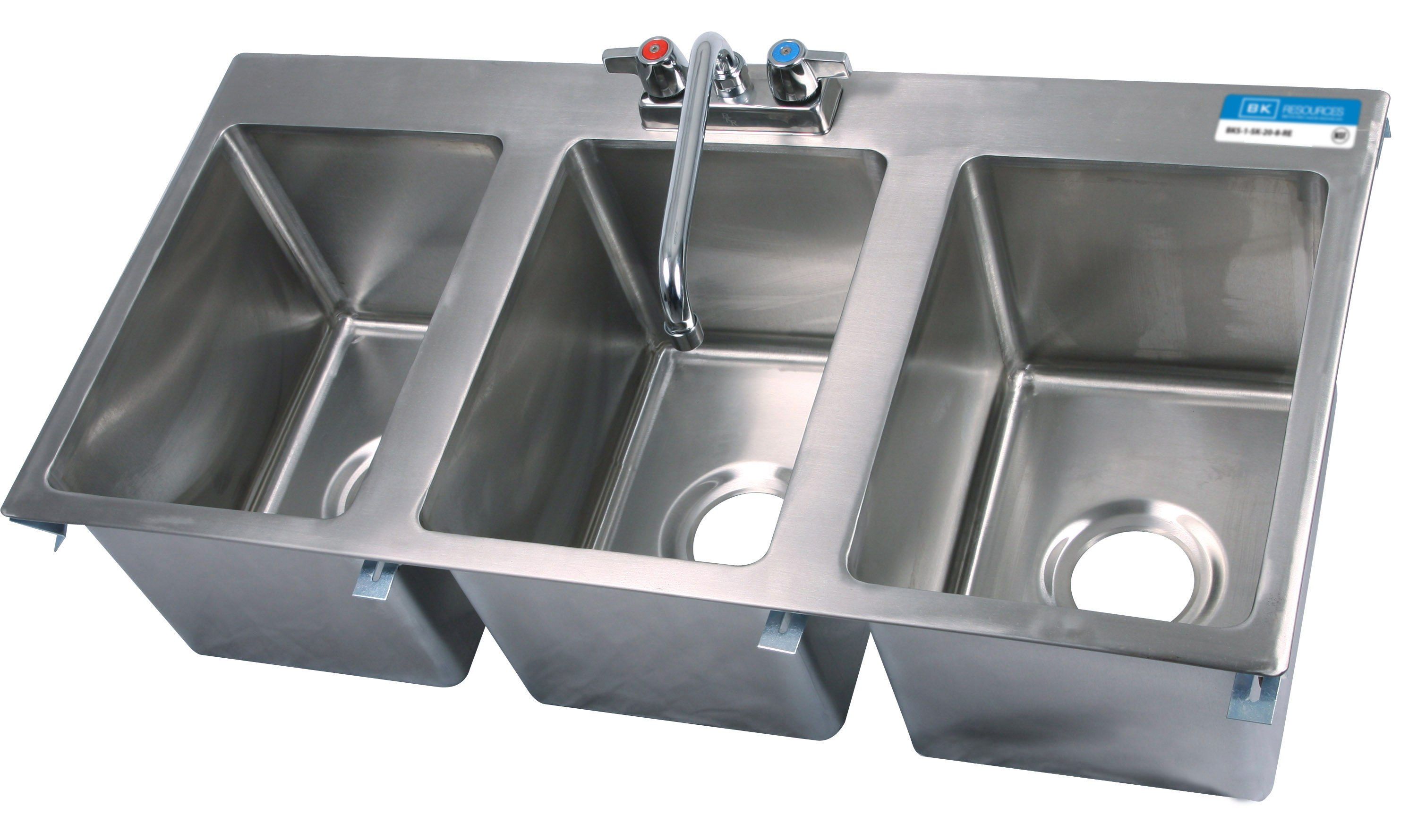 Drop-In Sink, three compartment, 24″W x 18″D O.A., 18/304 stainless steel construction, 10″ wide x 14″ front-to-back x 10″ deep bowls, 4″ O.C. deck mount faucet holes, 3-1/2″ drain openings, includes basket drains with crumb cup (BKDR-4), 35-1/8″ x 17-1/8″ cutout required, NSF