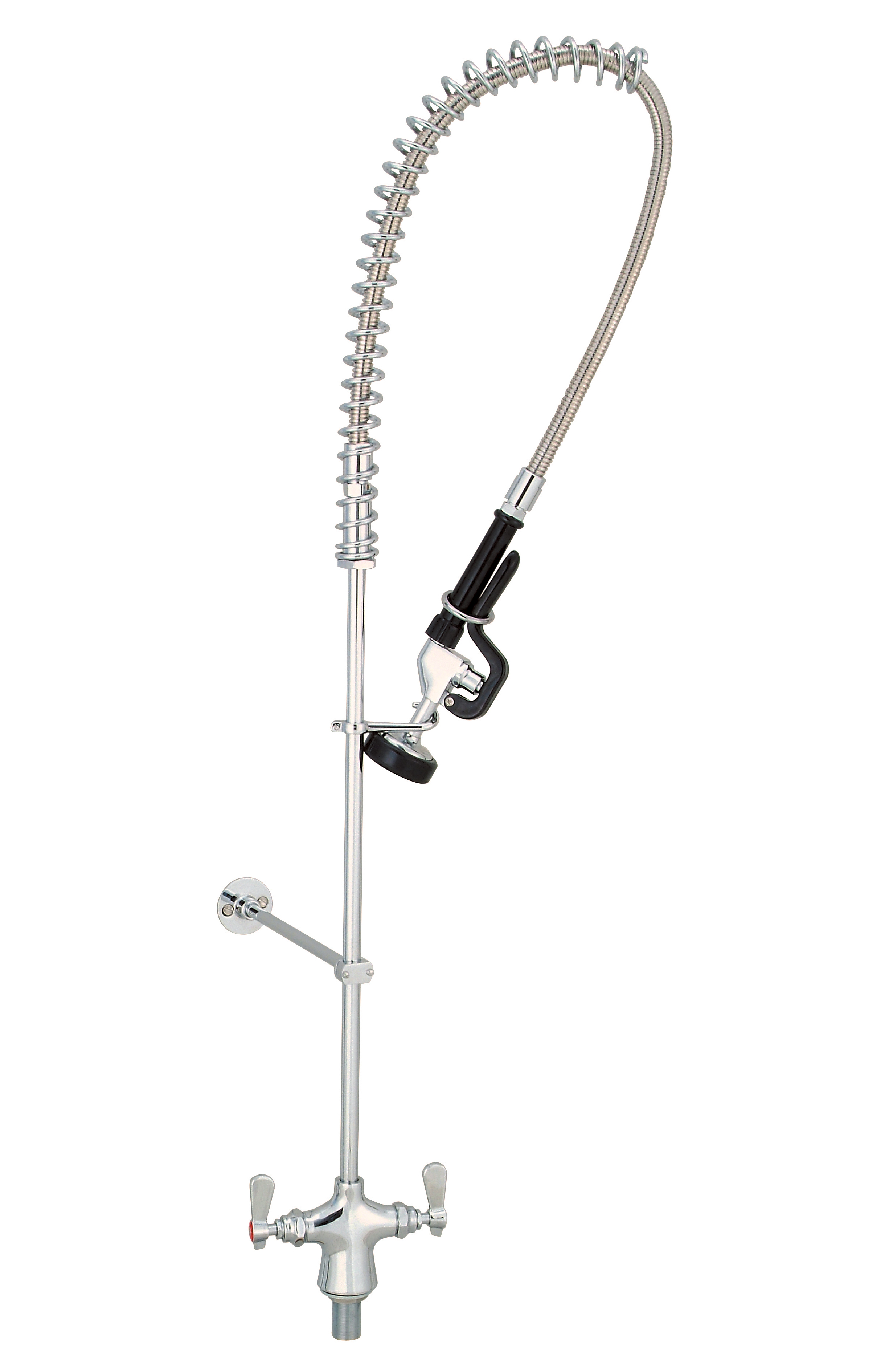 OptiFlow Pre-Rinse Assembly, one-hole deck mount with with BK-PRV-1-G low-flow pre-rinse spray head, includes 44″ stainless steel braided hose (triple-ply @300PSI), 12″ wall bracket, integral check valve, 1/4 turn ceramic valves, includes H/C mixing hoses, lead free, ANSI/NSF 61 Section 9-G, 3 Year Warranty