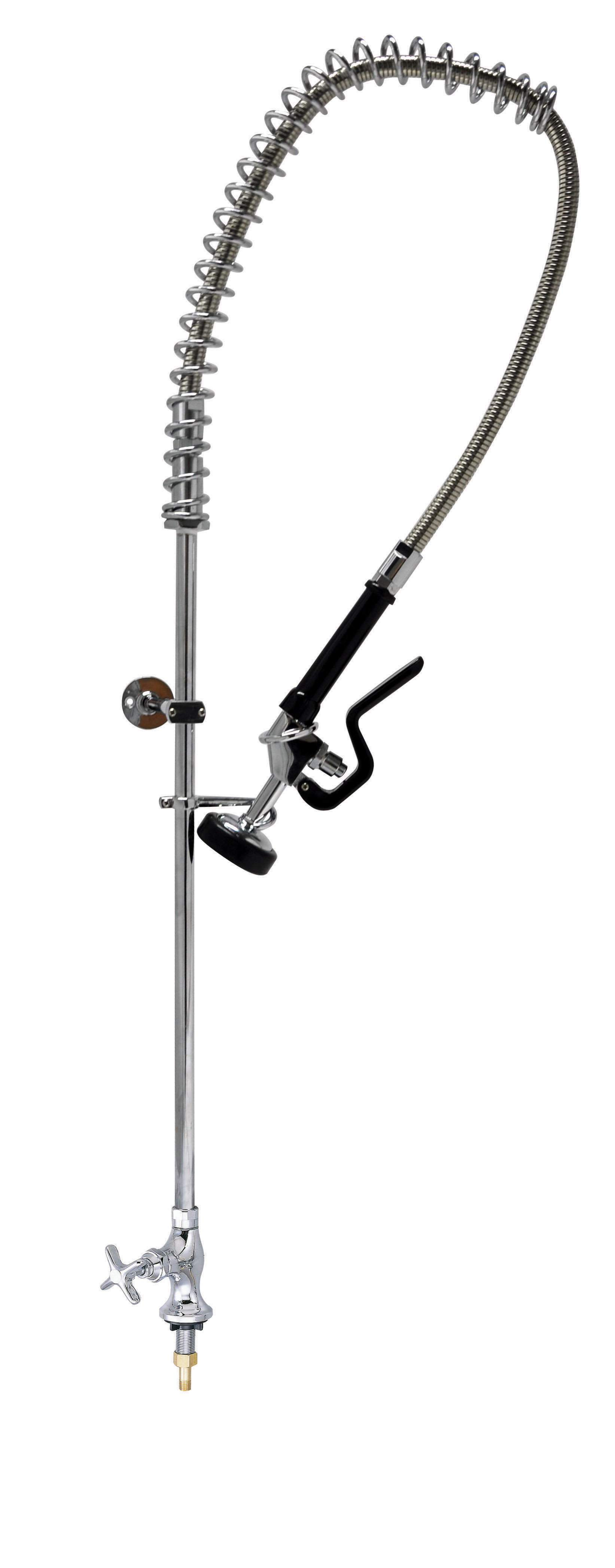 OptiFlow Pre-Rinse Assembly, single valve deck mount, includes 44″ stainless steel braided hose (triple-ply @300 PSI),With Low Flow Spray Head – rated Less Than 1 Gallon/Min., 12″ wall bracket, integral check valve, 1/2″ female inlets, 1/4 turn ceramic valves, lead free, ANSI/NSF 62, 3 Year Warranty