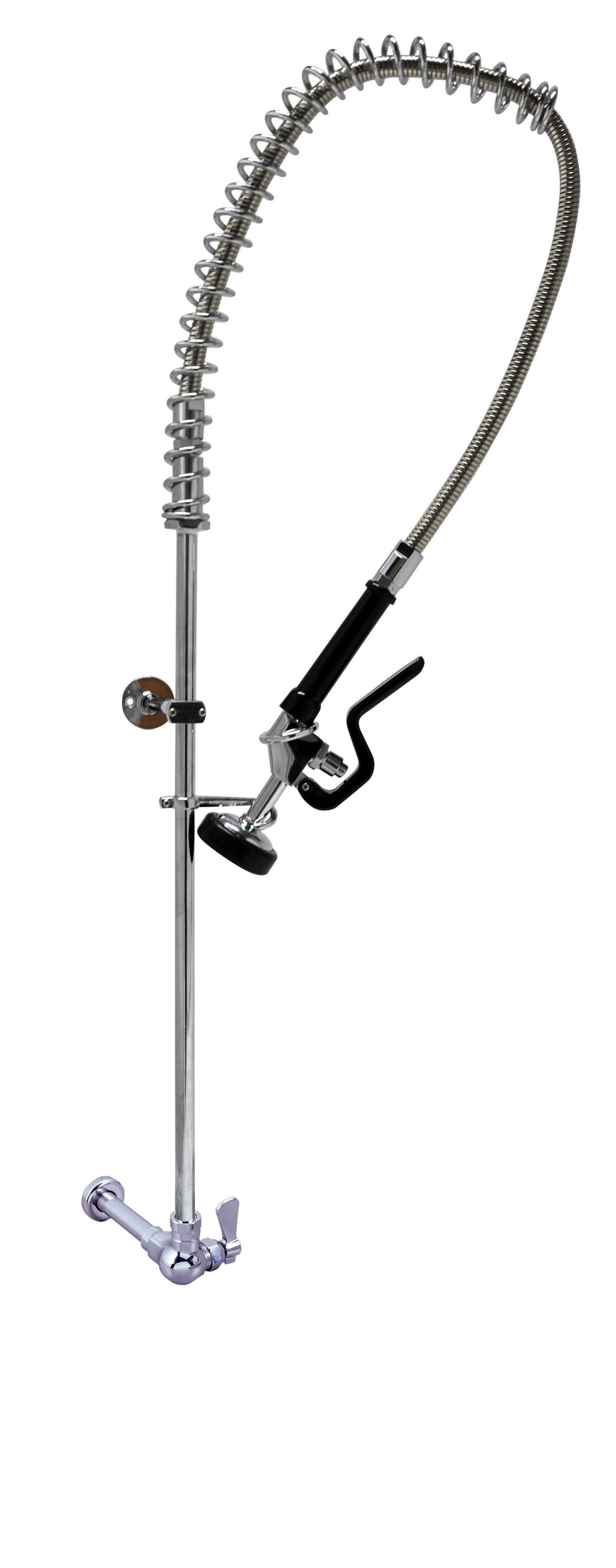 OptiFlow Pre-Rinse Assembly, single valve splash mount, includes 44″ stainless steel braided hose (triple-ply @300 PSI), With Low Flow Spray Head – rated Less Than 1 Gallon/Min., 12″ wall bracket, integral check valve, 1/2″ female inlets, 1/4 turn ceramic valves, lead free, ANSI/NSF 62, 3 Year Warranty