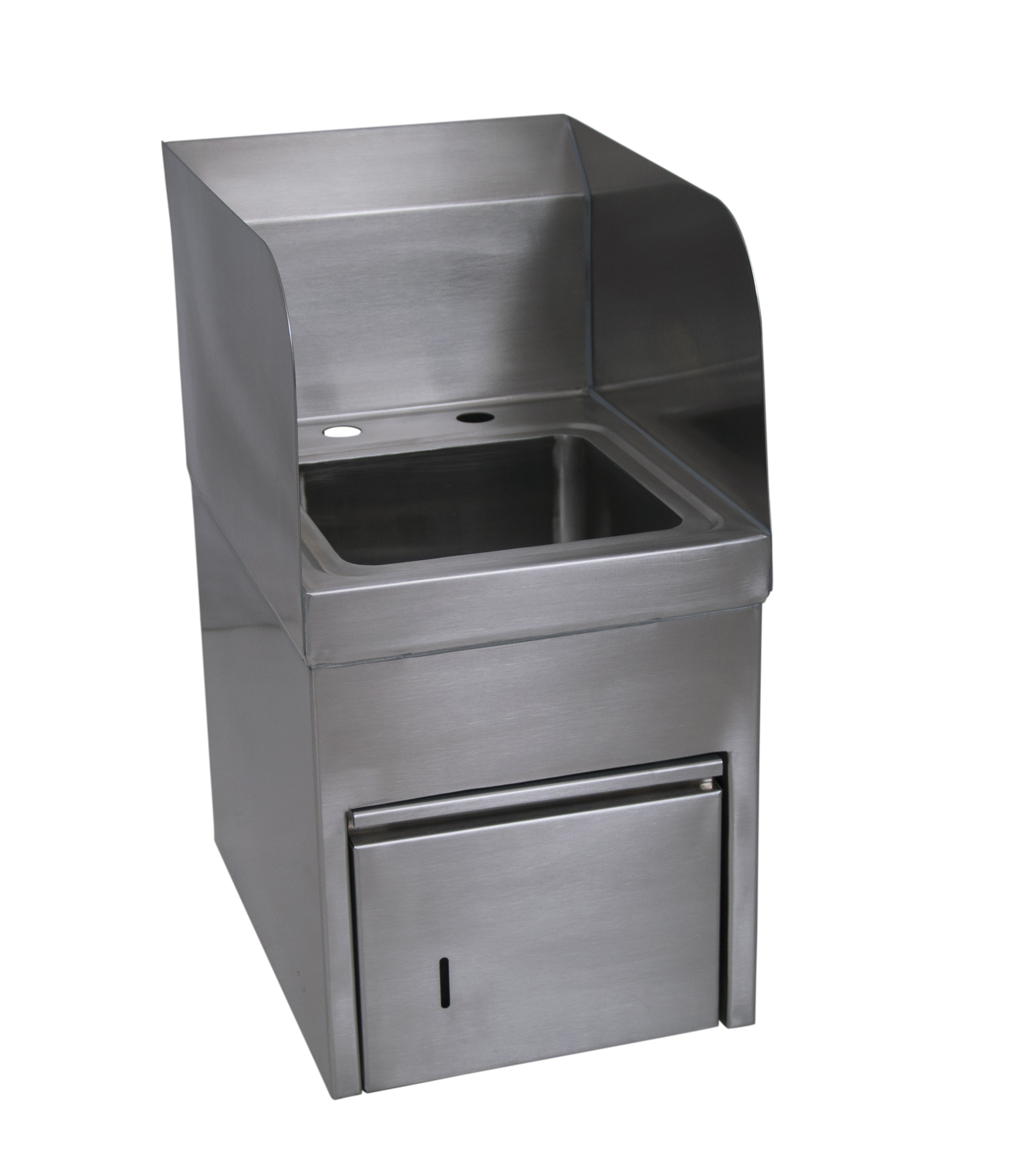 Hand Sink, wall mounted, sink only, with integrated towl dispenser, 9″W x 9″D, 1-4″ o/c deck mount faucet holes, BKDR-2 basket drain included, 18/304 stainless steel, NSF