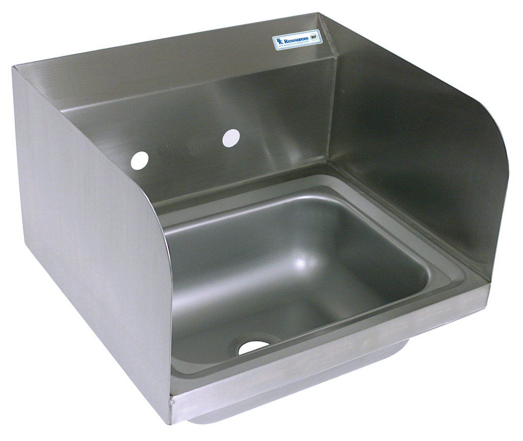Hand Sink, wall mount, 14″ wide x 10″ front-to-back x 5″ deep bowl, 304 stainless steel, 1-7/8″ basket drain with crumb cup, single splash mount faucet hole, dual side splash, wall bracket included, NSF