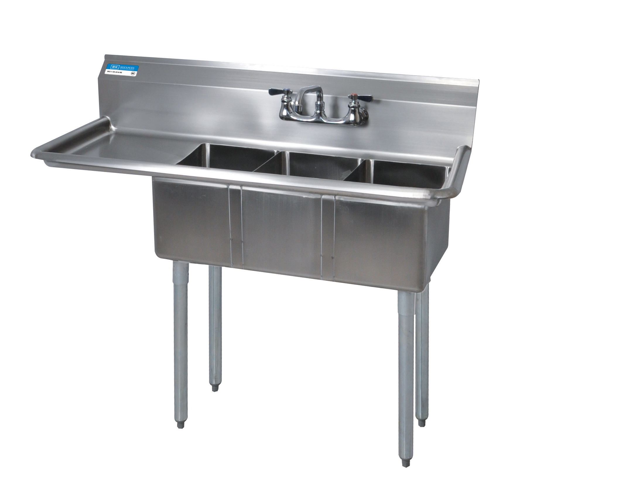 Convenience Store Sink, three compartment, 47-1/2″W x 19-13/16″ 18/304 stainless steel construction, 10″ wide x 14″ front-to-back x 10″ deep compartments, 15″ drainboard on left, 9″H backsplash, 8″ O.C. splash mount faucet holes, includes basket drains, galvanized steel legs & adjustable plastic bullet feet, NSF
