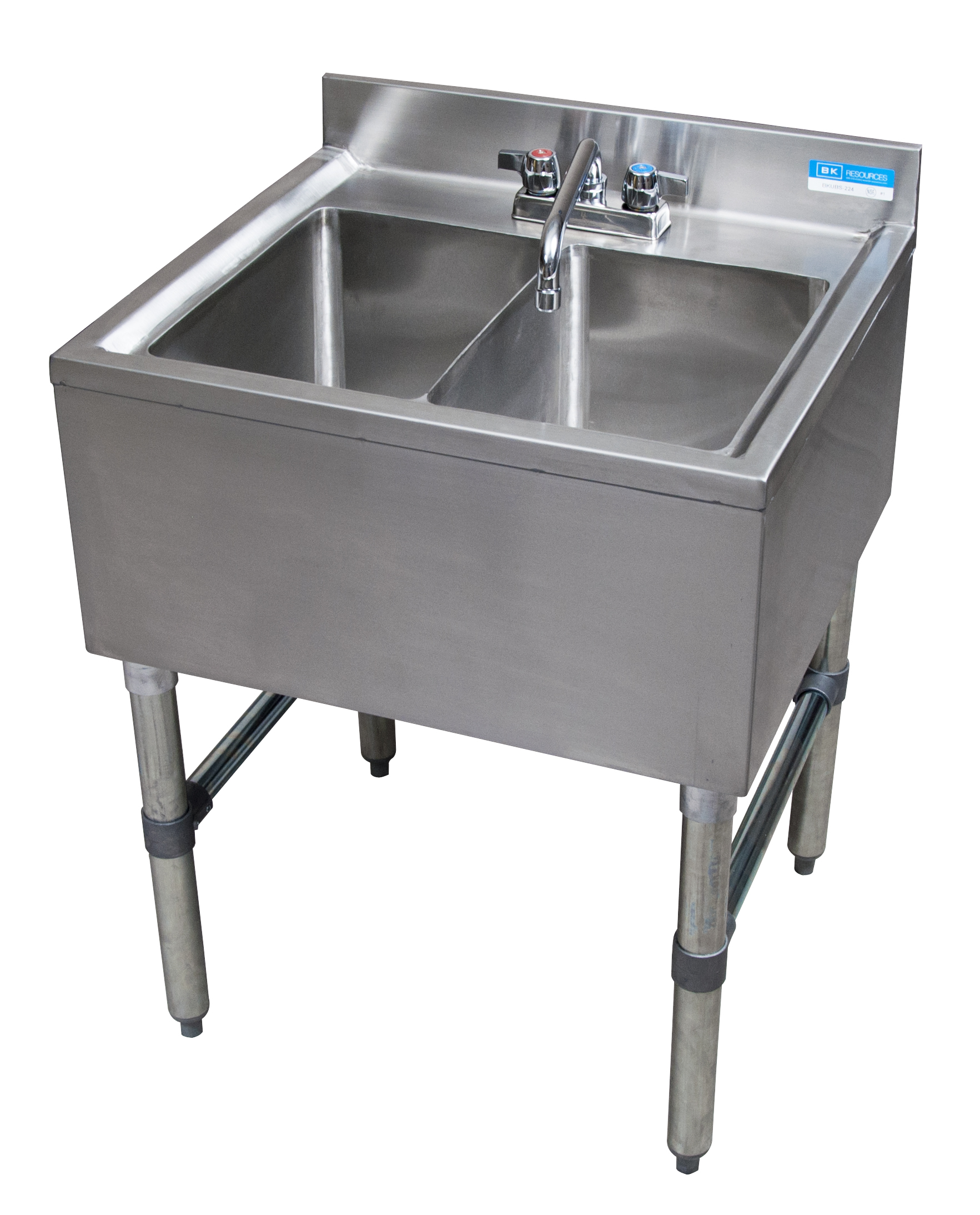 Underbar Sink, two compartment, 24?W x 21-1/4″D x 32-1/2″H, 18/304 stainless steel construction, 10″ wide x 14″ front-to-back x 10″ deep compartments, 4-1/2″H backsplash, 4″ O.C. deck mount lead-free faucet (BKD-10-G), stainless steel apron on front & sides, includes basket drains (BKDR-2) & removable overflow standpipes (BK-OT-15075), stainless steel legs & adjustable side bracing, adjustable high-impact corrosion-resistant feet, NSF