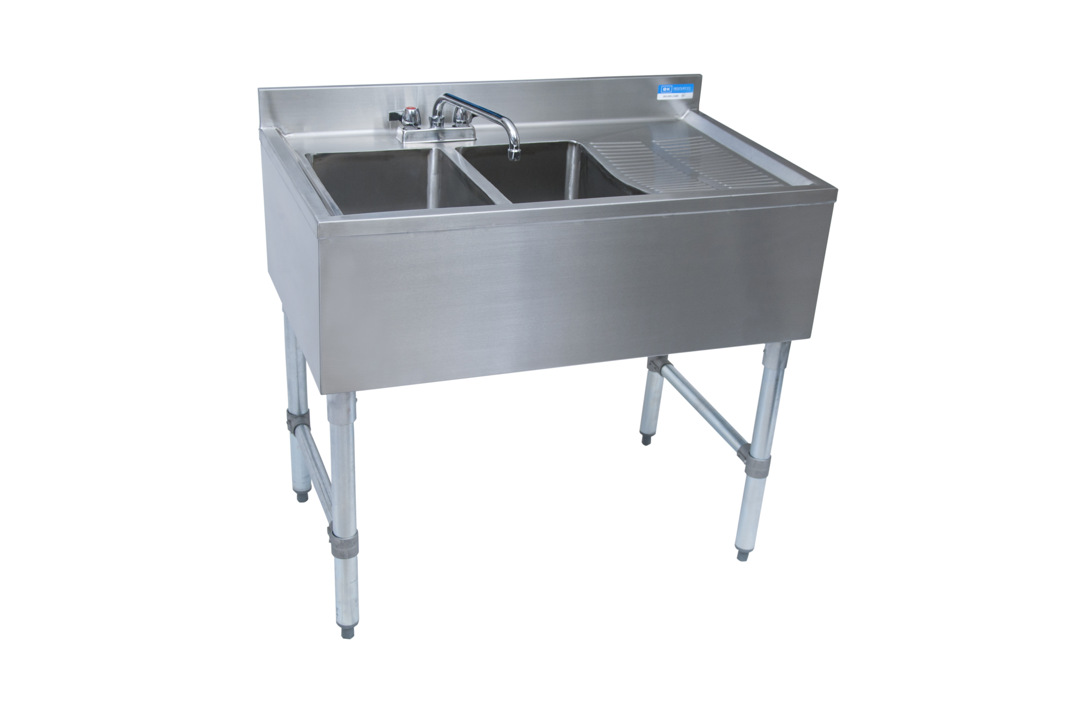 Underbar Sink, two compartment, 36?W x 21-1/4″D x 32-1/2″H, 18/304 stainless steel construction, 10″ wide x 14″ front-to-back x 10″ deep compartments, 12-3/4? stamped drainboard on right, 4-1/2″H backsplash, 4″ O.C. deck mount lead-free faucet (BKD-10-G), stainless steel apron on front & sides, includes basket drains (BKDR-2) & removable overflow standpipes (BK-OT-15075), stainless steel legs & adjustable side bracing, adjustable high-impact corrosion-resistant feet, NSF