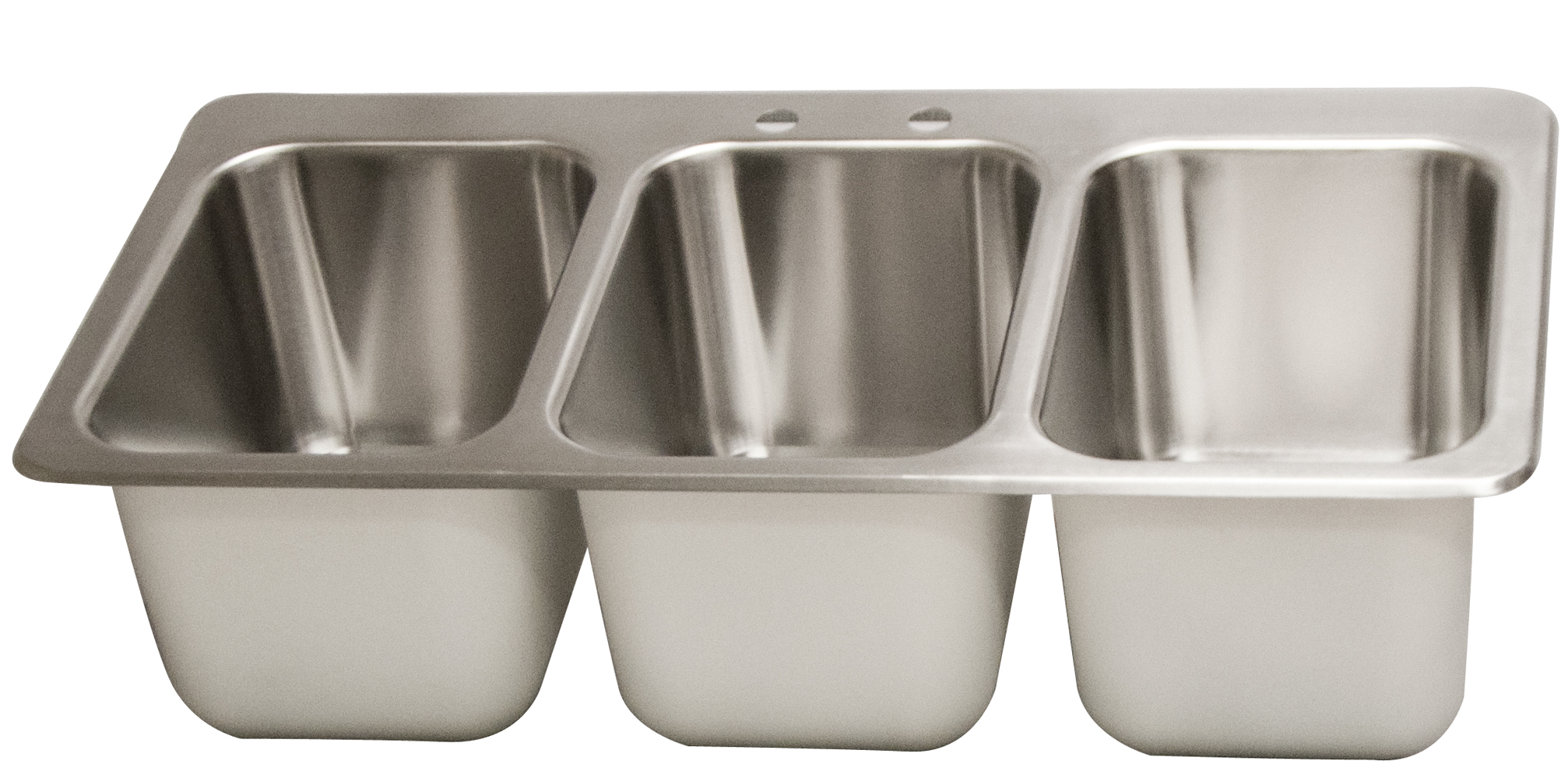 Deep Drawn, Three Compartment Drop In Sink, T-304 18 ga Stainless Steel, Traditional Top Mount, includes BKD-8G-G faucet, includes (3) basket drain with crumb cup (BKDR-4), 10″ x 14″ x 10″ (d) bowl size, 55-3/4″ x 25″ overall size