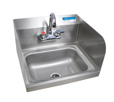 Hand Sink, wall mount, 14″ wide x 10″ front-to-back x 5″ deep bowl, 4″ O.C splash mount faucet (BKF-W-3G-G, lead free), marine edge, side splashes on left & right, includes basket drain & wall mounting hardware, 304 stainless steel construction, NSF